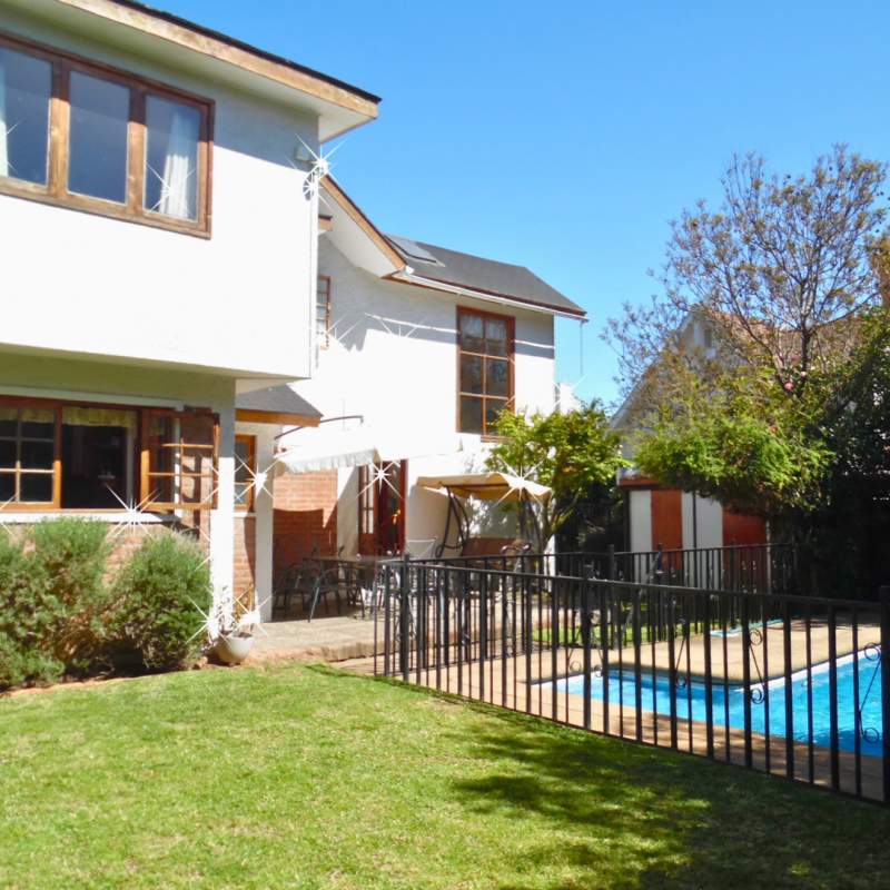 El exterior ofrece lindos jardines y piscina privada, ideales para disfrutar en familia o con amigos.